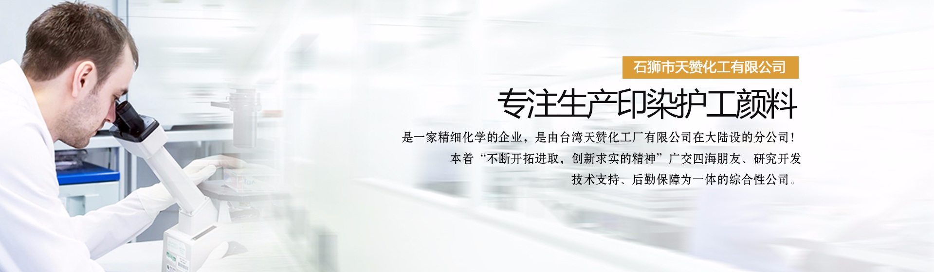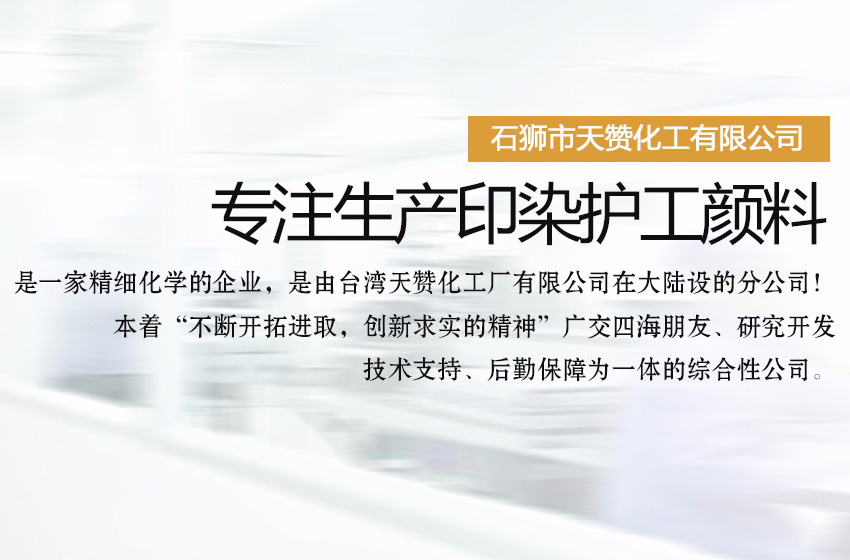 石獅市天贊化工有限公司是一家生產(chǎn)印染護(hù)工顏料的公司,是一家精細(xì)化學(xué)的企業(yè),是由臺(tái)灣天贊化工廠有限公司。在大陸設(shè)的分公司!本著“不斷開拓進(jìn)取,創(chuàng)新求實(shí)的精神”廣交四海朋友、研究開發(fā)、技術(shù)支持、后勤保障為一體的綜合性公司。二十年來,我們對(duì)紡織,前處理,后整理,技術(shù)的研究實(shí)踐中體會(huì)得經(jīng)驗(yàn)。